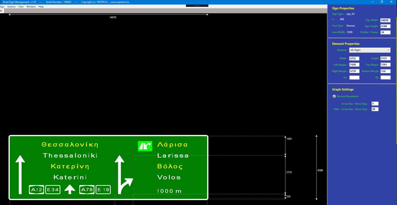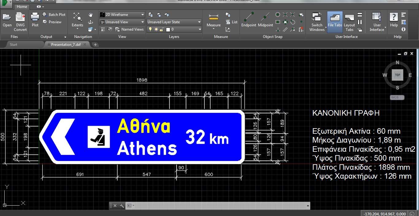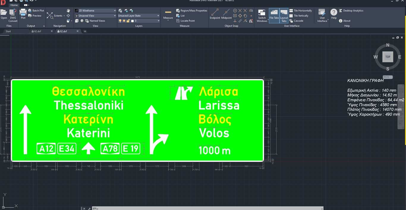 Ιδιαίτερα για τις αναγραφές προορισμού, οι διαστάσεις των χαρακτήρων και οι μεταξύ τους αποστάσεις έχουν υπολογιστεί με βάση τις προδιαγραφές των κανονισμών, τόσο για Κανονική όσο και για Στενή γραφή, σε όλες τις πνακίδες που περιέχουν αυτές τις αναγραφές. Η παραπάνω διαδικασία ολοκληρώνεται με την παραγωγή του σχεδίου σε αρχείο AutoCAD, για την ολοκλήρωση της εκπόνησης της μελέτης.
